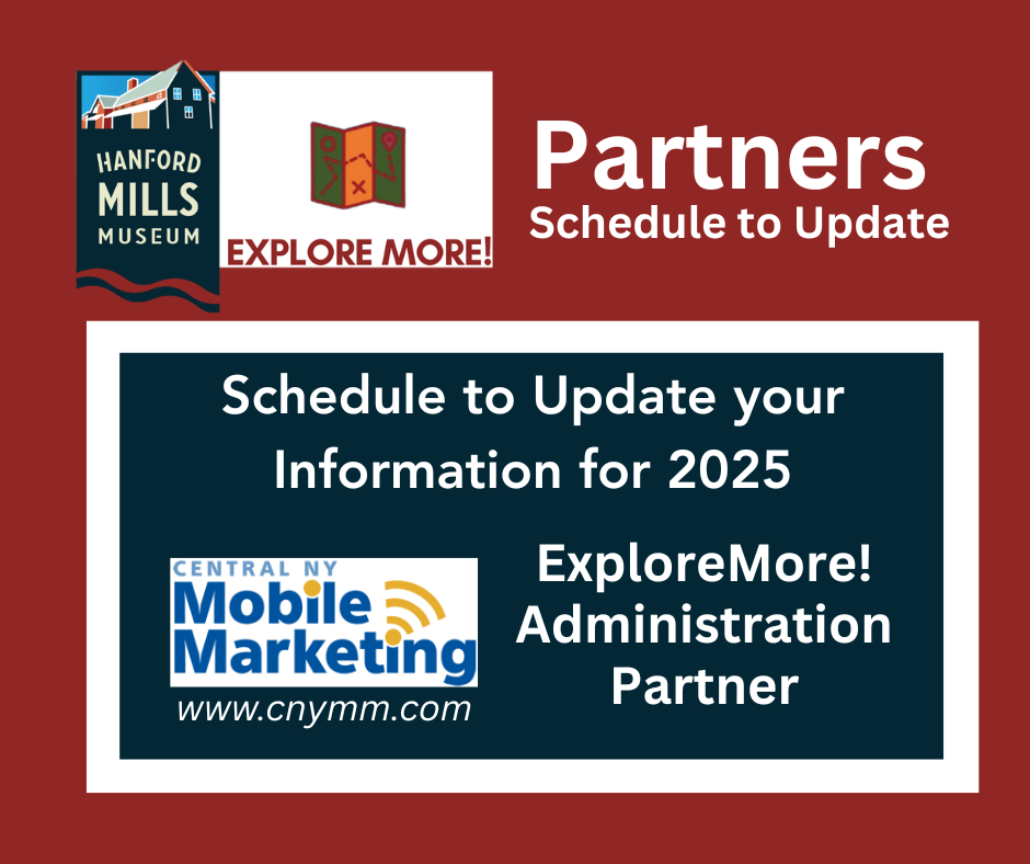 Hanford Mills Museum is continuing its ‘Explore More!’ Regional Promotions program in 2025, building on 4 years of local impact. The program, launched in the summer of 2021 to support the promotion of our regional assets, provides information about ‘more’ things to do in our region, including: places to visit and things to see; where to find food and provisions; and local treasures for retail shopping. In 2022, partner calendar event promotions were added to the program. In 2025, the program is continuing through the fiscal sponsorship of Hanford Mills Museum, making it possible to offer the opportunity at no cost to participating partners. The program, now in its fifth year, will again be administered by Susan O’Handley, Central NY Mobile Marketing, on behalf of Hanford Mills Museum.