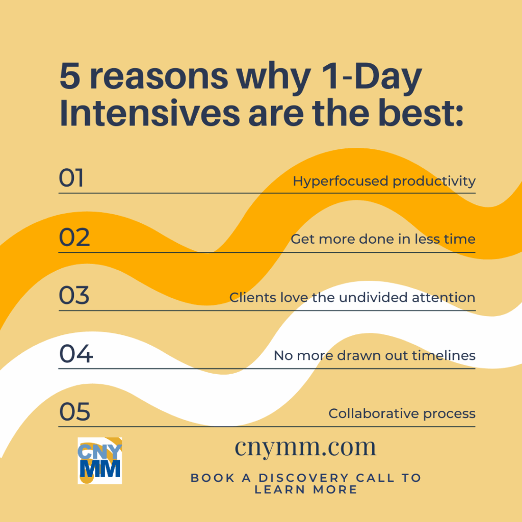 If you’ve got a list of marketing objectives and goals that have been piling up because you don’t have time (because you are busy running your business/organization), then a 1-Day Intensive might be just the thing to help you get things done.